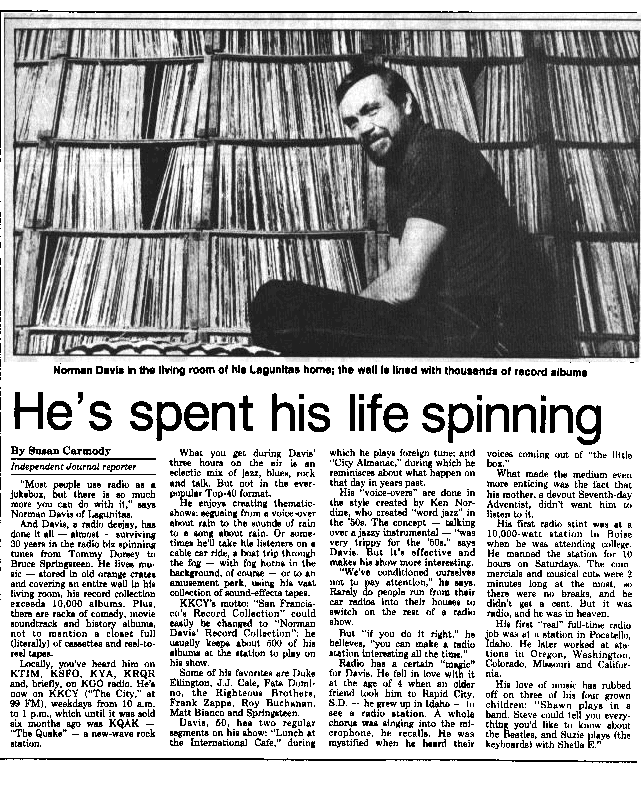 "The City" was an ambitious effort to recreate the sound and the magic of KSAN. Former KSAN program directors Tom Yates and Kate Hayes were in charge of programming. They put together a great crew which included; Norman Davis, Dave McQueen, Rosemary Greyshock, Dick Conte, Michael Knight, Dan Carlisle, Lorraine Meyer, Alan Burton, Brook Jones, Marshall Phillips, Andy Lee, Susie Davis, "Al Dente", Mimi Chen and New York Vinnie. Although highly rated in San Francisco, out of town ratings were poor because of the station's weak signal. Financial problems forced the owners to sell the station in 1989 to James Gabbert, who changed the call letters to KOFY and set about destroying the station's eclectic format post haste. The article below was written during Norman's time at "The City".