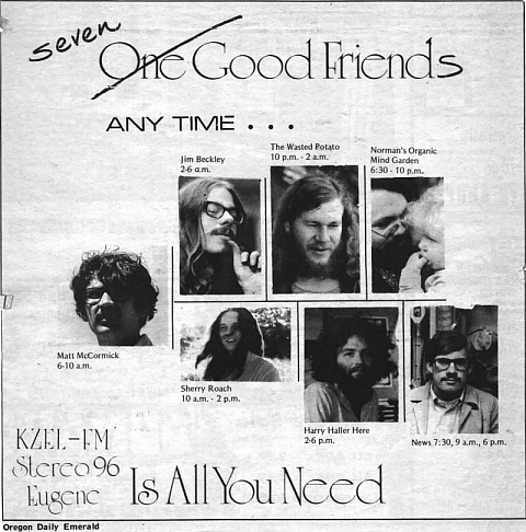 KZEL was Norman's first "underground" station. He left a weekend job at KSFO to do afternoons at a little hippie station, located in an old Laundromat, in Eugene, Oregon. Creative freedom was the incentive, certainly not the salary, which was $50 a week plus rent and utilities. KZEL was eclectic and fun to listen to, but lack of funds (frequently there was no money on pay day) and management problems caused most of its staff to move on. Program Director Thom O'Hair left for greener pastures at KSAN, and he got Norman a job there a year later.